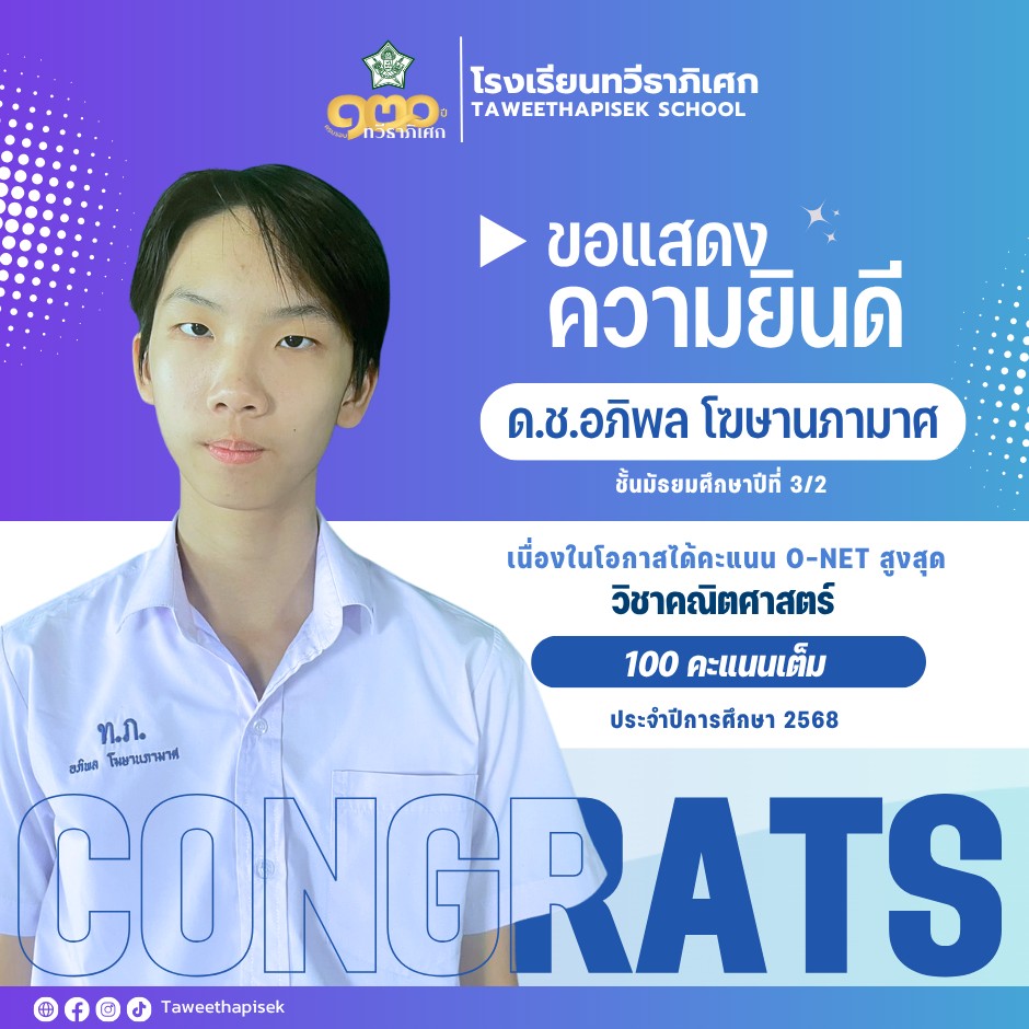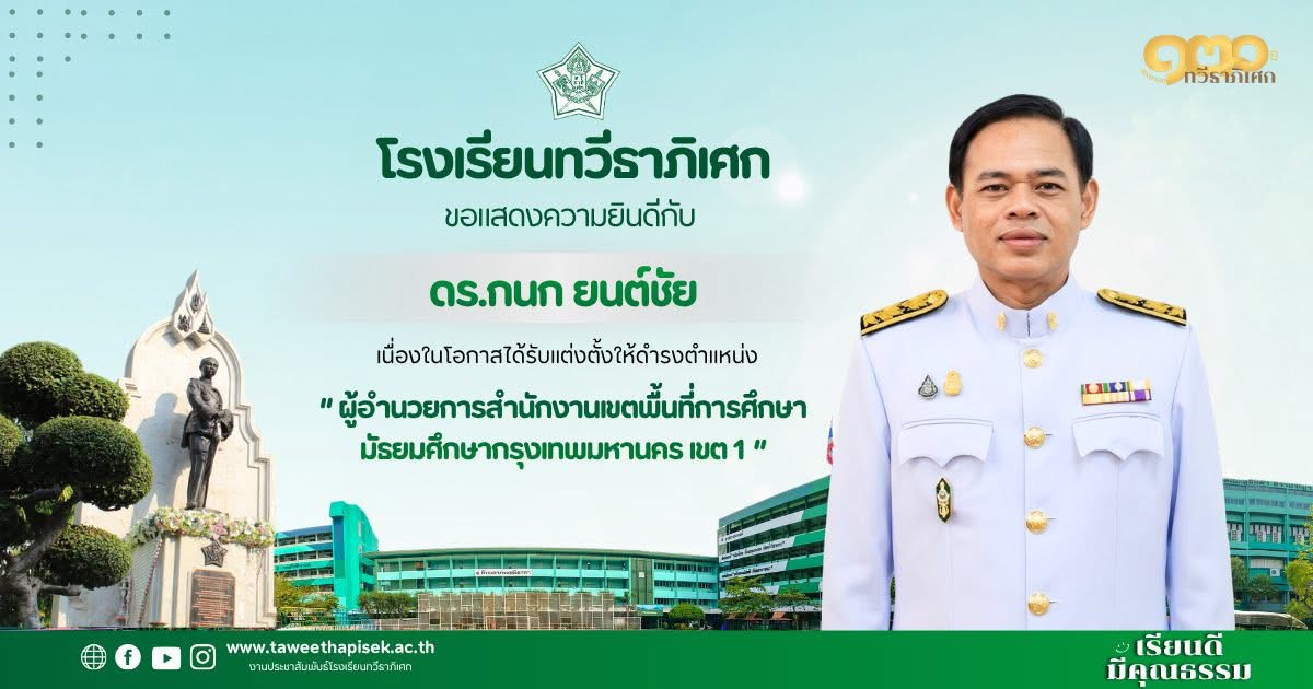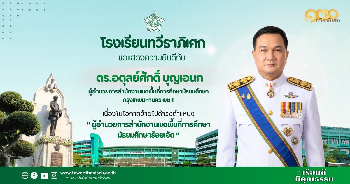 “ขอให้นักเรียนทำความดีตลอดเวลา ตั้งใจศึกษาหาความรู้อยู่เสมอ กลับมาดูแลโรงเรียนทวีธาภิเศกทุกครั้งที่มีโอกาส ตอบแทนคุณแผ่นดินและรักษ์โลกนี้ตลอดชีวิต”