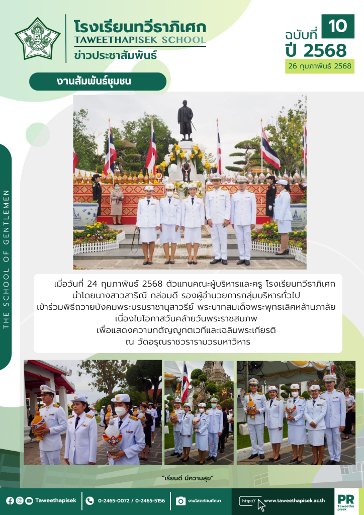 ตัวแทนคณะผู้บริหารและครู โรงเรียนทวีธาภิเศก เข้าร่วมพิธีถวายบังคมพระบรมราชานุสาวรีย์ รัชกาลที่ 2เมธาวี สมัยพิทักษ์26/02/2025จดหมายข่าว Post Views: 5