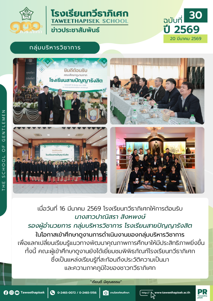 ให้การต้อนรับ “โรงเรียนสายปัญญารังสิต ” ในโอกาสเข้าศึกษาดูงานการดำเนินงานของกลุ่มบริหารวิชาการ เพื่อแลกเปลี่ยนเรียนรู้เมธาวี สมัยพิทักษ์20/03/2026จดหมายข่าว Post Views: 5